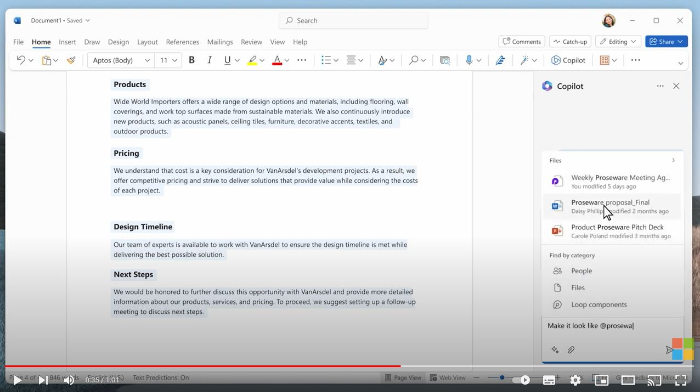 새롭게 발표된 Copilot은 사용자가 문서나 ppt, 메일 등을 작성하는 데 도움을 주는 Microsoft 365 앱 및 서비스용 AI 기반 도우미입니다. OpenAI의 GPT-4로 구동되는 Copilot은 Microsoft 365 앱과 함께 챗봇으로 제공되며, Office 사용자는 이를 호출하여 문서에 텍스트를 생성하고, Word 문서를 기반으로 PowerPoint 프레젠테이션을 만들거나, Excel의 피벗 테이블과 같은 기능을 사용할 수 있습니다. Copilot은 Microsoft의 Office 앱 전체에서 활용할 수 있으며 Word에서 다른 파일을 기반으로 문서 초안을 작성하는 데도 사용할 수 있습니다. Copilot은 기본적으로 챗봇이기 때문에 사용자는 Word 문서를 기반으로 10개의 슬라이드로 구성된 PowerPoint 프레젠테이션을 만들거나 Excel 데이터를 분석하거나 서식을 지정하도록 요청할 수도 있습니다.